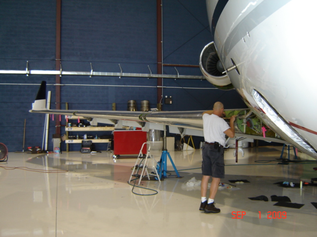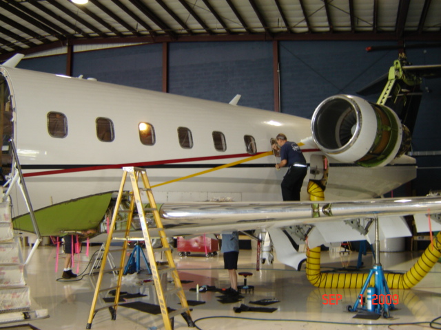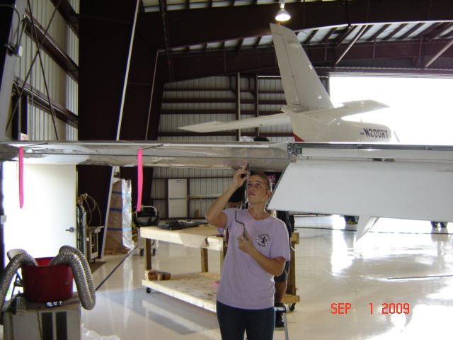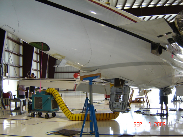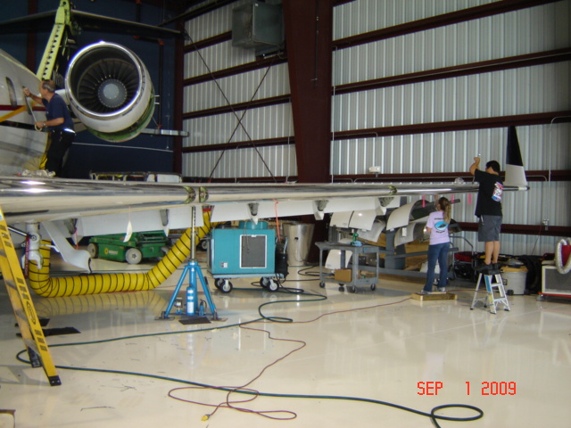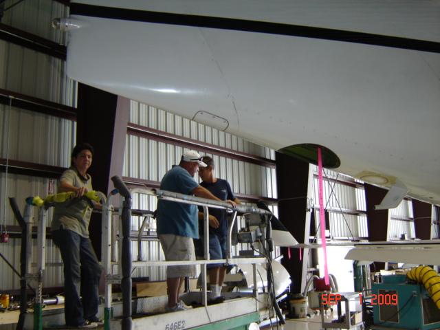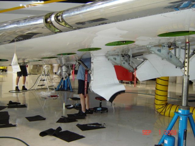 The wing leading edge is in the process of being reinstalled, the window is being repaired and the fuel tank inspection panels are being readied for installation.